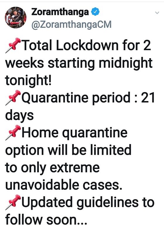 Tun dinhmunah chuan Mizoram kan buai ta ber a, heihi a chhan ber chu Covid-19 hian kan Society a tihchhiat kan duh loh avang niin a lang. Covid-19 avanga tangkhang rawn haw te kan en hrang lo hle a, Quarantine centre tam taka awm mek leh duty te an inpawh tha a, centre a awmten thil lei tura an tirh deuh reng te pawh an awm ni a sawi a ni. Hei mai hi a ni lo a, quarantine centre a awm lo tlawh a lo in selfie pui tawk an lo awm bawk. Positive kan han nei ta mai si a kan buai zo ta ani. Hetiang hi awm lo sela chuan Total Lockdown hi a țulna pakhatmah a awm lo a, a awm miau si avangin loh theih lohin Total Lockdown kan nei dawn ta nge nge a ni. Total Lockdown hi ni 21 nei law law i la, tuman bengvar chhuah a quarantine centre tlawh awm tawh lo sela kan him leh vek ang.
